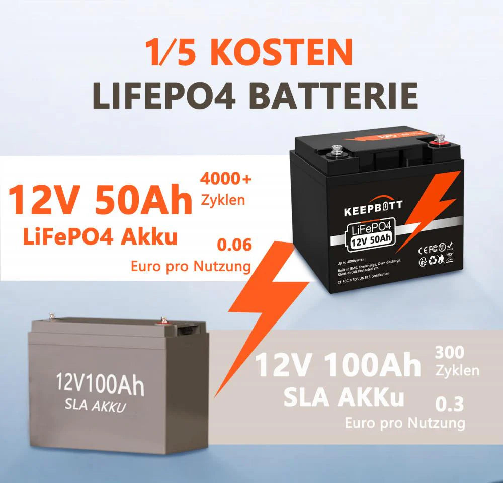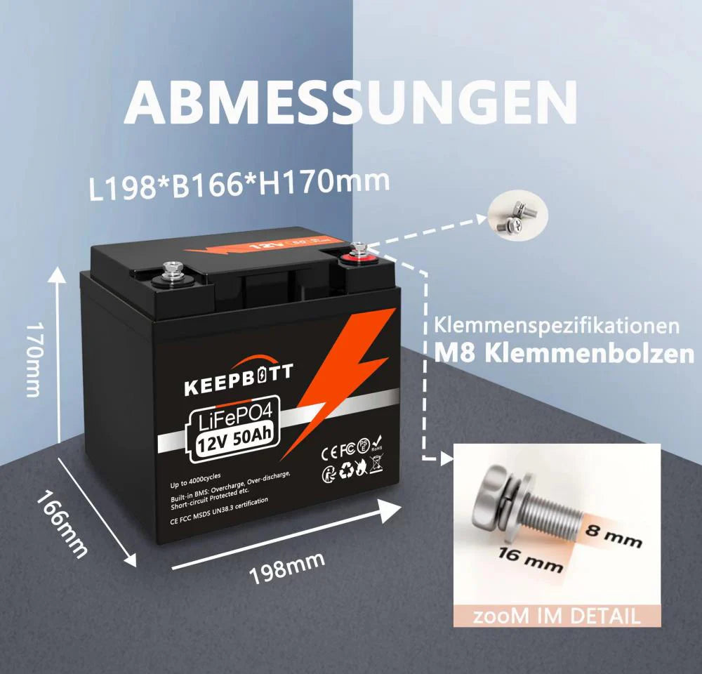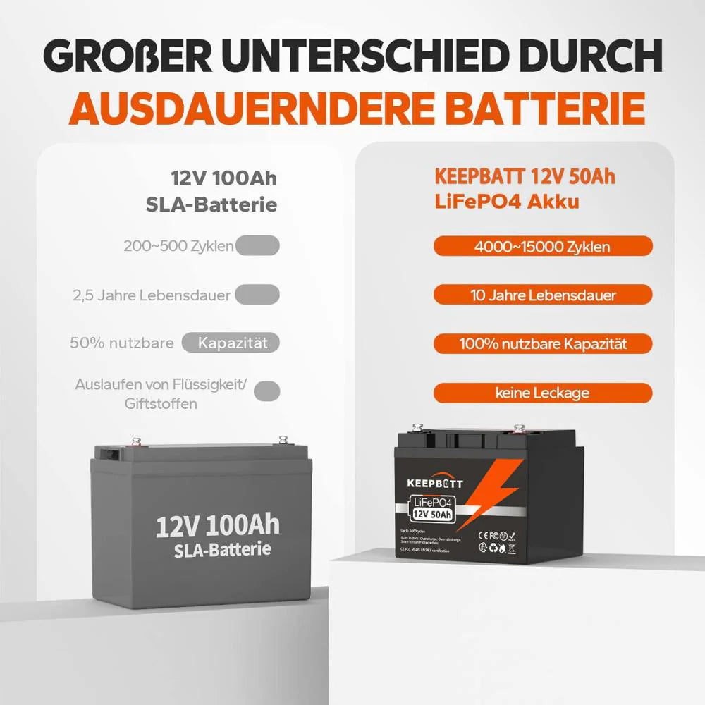 KEEPBATT LiFePO4 12V 50Ah bieten 4000~15000 Zyklen & eine Lebensdauer von 10 Jahren im Vergeich zu den 200-1000 Zyklen & einer 3-jährigen Lebensdauer von typischen Blei-Säure-Batterien. Unser 12V 50Ah LiFePO4 können ohne Risiko voll aufgeladen werden und bewahren, Mit einer niedrigen Selbstentladerate können Sie 12V LiFePO4 Batterie nutzen oder auch für längere Zeit lagern.