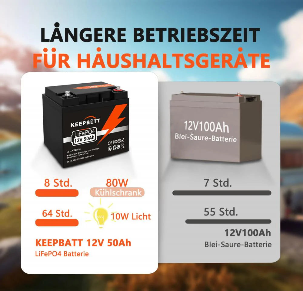 KEEPBATT 50Ah Batterie bietet 10 Jahre Lebensdauer und 4000 - 15000+ Zyklen im Vergleich zu den 2 Jahren Lebensdauer und 300+ Zyklen einer Blei-Säure-Batterie. Im Vergleich zu den 50% DOD der Blei-Säure-Batterie, bietet KEEPBATT 12V LiFePO4 50Ah Batterie 100% DOD, doppelt so viel nützliche Kapazität. Daher hat ein einzelner 12,8V LiFePO4 Akku 50Ah eine nutzbare Kapazität, die der eines einzelnen 12V 100Ah Blei-Säure-Akkus entspricht.