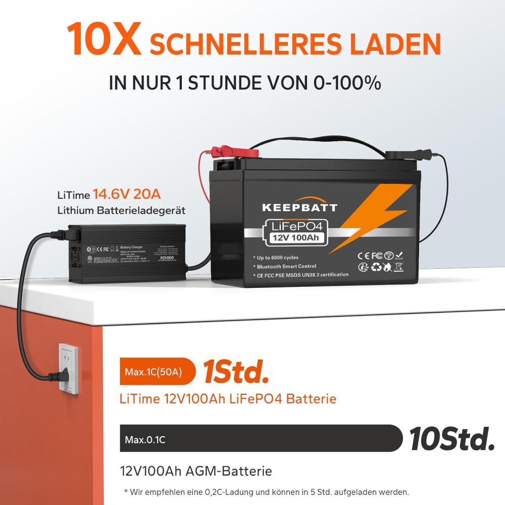 - 100A BMS: Unsere 12-Volt-Lithium-Batterie ist mit einem 100A BMS ausgestattet, das die 12-Volt-Lithium-Batterie vor Überladung, Kurzschluss und Überhitzung schützen kann, um den Ausfall der 12-Volt-Lithium-Batterie zu vermeiden und die Sicherheit zu gewährleisten. Unterstützt 20-50A Hochstrom-Schnellladung, spart Ihnen 50% der Ladezeit im Vergleich zu AGM / SLA-Batterie.