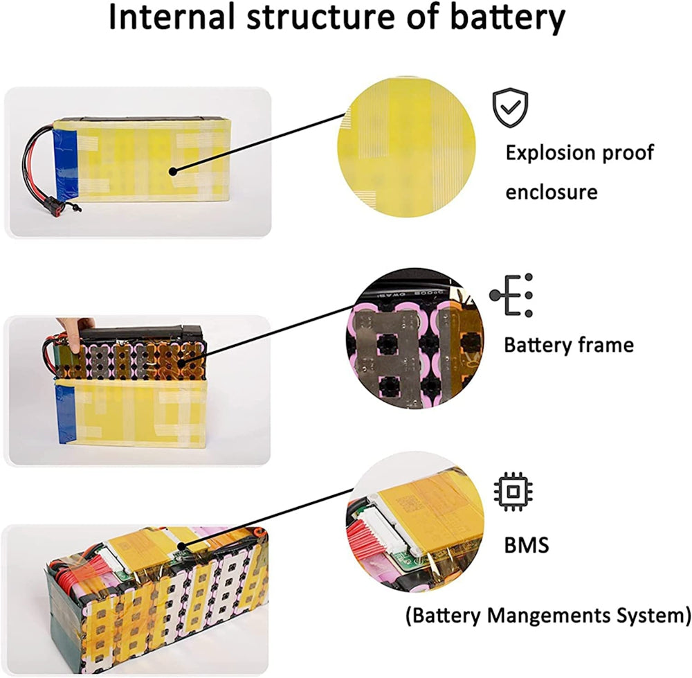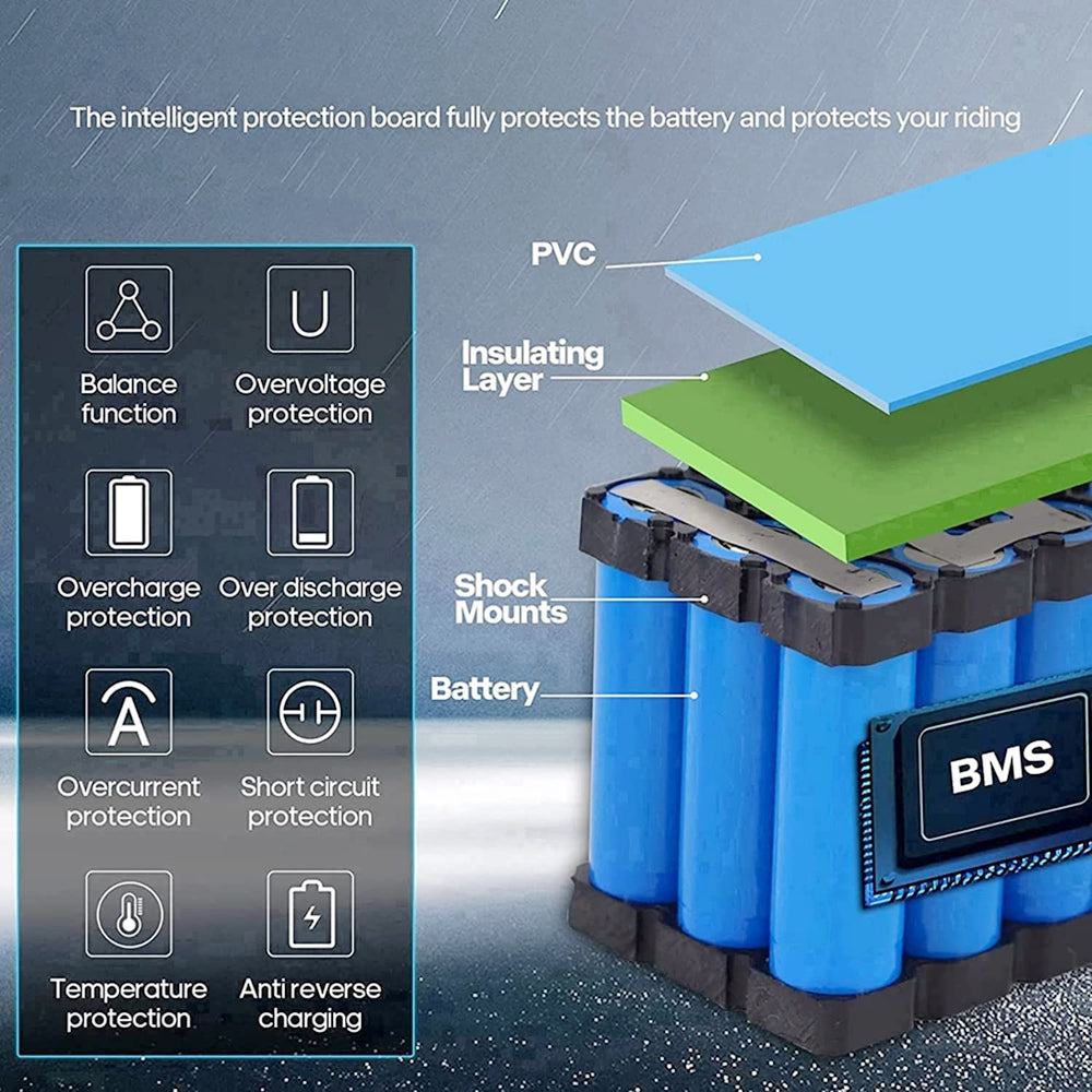 - 800-1000 Mal Usec-Zyklus. Der Ladezyklus des E-Bike-Akkus übersteigt 1000 Mal. Jede Lithinum-Batterie hat den QC-Test für Aussehen und Funktion vor dem Versand bestanden. Hochwertige Samsung-Elektrozellen und eine eingebaute 50A BMX-Schutzplatte verhindern Überladung, Überentladung, Überstrom und Kurzschluss und gewährleisten eine lange Lebensdauer. Mode-Design mit Montageplatte, einfach zu installieren und zu entfernen.